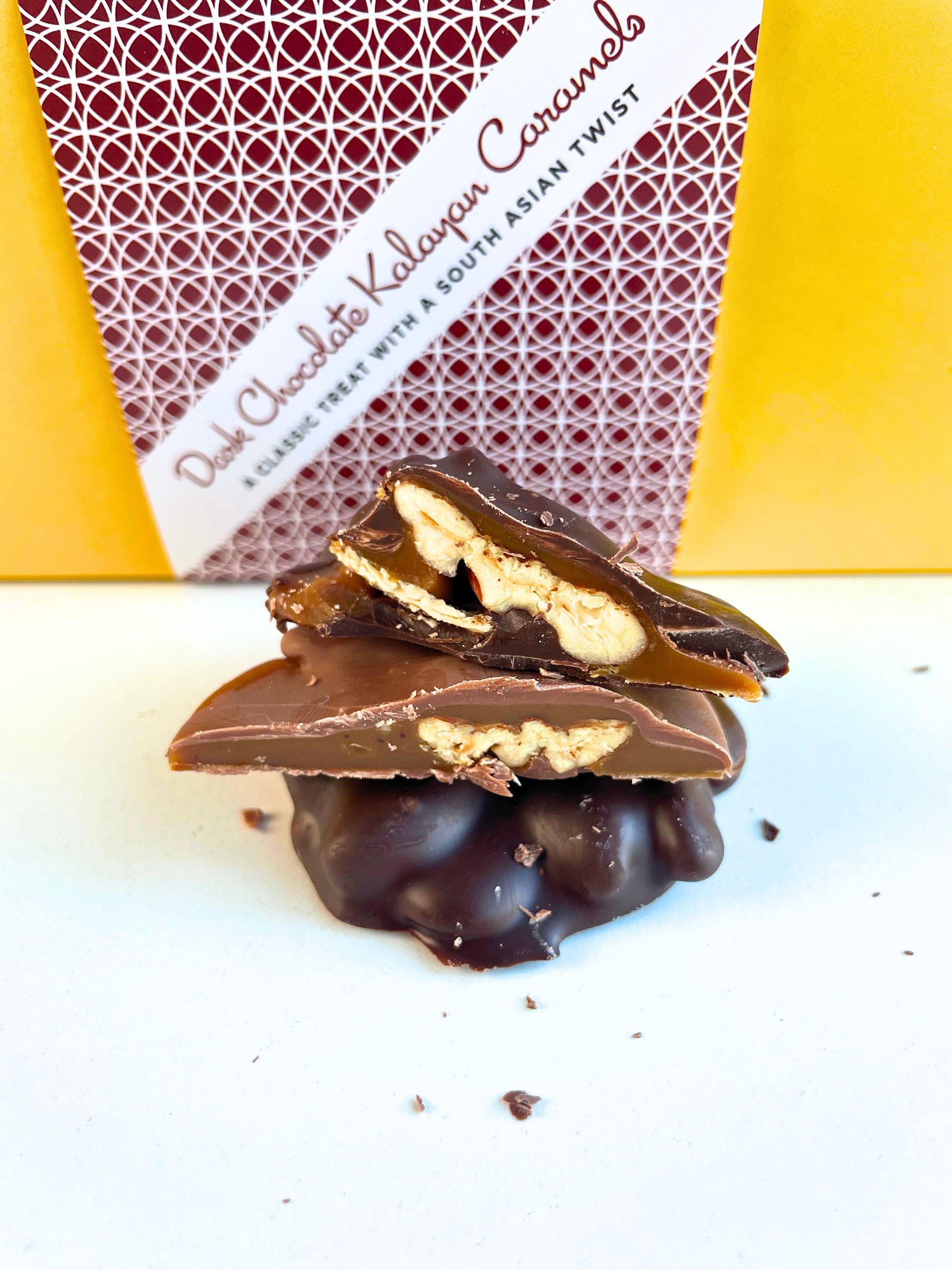 Includes 6 kalayan caramels (turtles). Available in dark or milk chocolate. Handcrafted in small batches with Himalayan black salt and Texas pecans.
